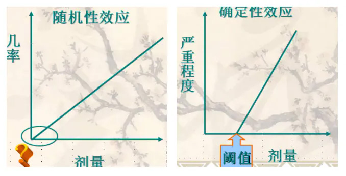 1.隨機性效應(yīng):無劑量閾值有害效應(yīng)的嚴重程度與受照劑量大小無關(guān),任何微小的劑量也可引起效應(yīng),只是發(fā)生的幾率極其微小而已。如:致癌效應(yīng)(癌癥 、白血?。?; 遺傳效應(yīng)(損傷發(fā)生在具有遺傳信息的功能細胞上,發(fā)生的效應(yīng)將顯現(xiàn)在受照者的后代身上)。