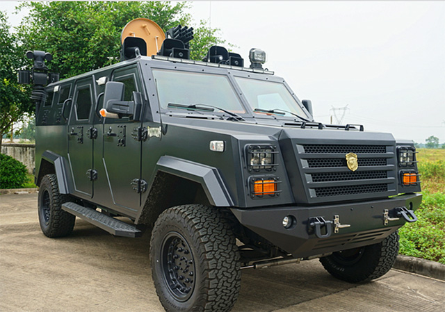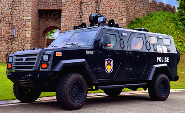 國(guó)產(chǎn)“黑豹”防暴裝甲運(yùn)兵車是根據(jù)美國(guó)進(jìn)口福特E350改裝而成的5噸級(jí)防爆裝甲車。該車可搭載8名特警隊(duì)員,整車長(zhǎng)5.8米,寬2.2米,高2.3米。車身采用進(jìn)口防彈材料制作并采用自主重疊式的防彈結(jié)構(gòu),防護(hù)性能優(yōu)越。該車試用于軍隊(duì)、武警、公安、邊防等部門執(zhí)行反恐維穩(wěn)、邊防巡邏、緝毒抓捕等任務(wù)。防暴裝甲運(yùn)兵車該車還有5個(gè)車門,以確保隊(duì)員快速上下。超大馬力的進(jìn)口發(fā)動(dòng)機(jī),使得整車動(dòng)力強(qiáng)勁,最高時(shí)速達(dá)140km/h。特警支隊(duì)相關(guān)負(fù)責(zé)人介紹:這輛“黑豹”防爆裝甲車可執(zhí)行追鋪、反恐、偵查、巡邏等任務(wù)。防暴裝甲運(yùn)兵車同時(shí)配備了防彈輪胎,輪胎在中彈和刮破后任可繼續(xù)前行80多公里。該車車身四面防彈,前后裝有防撞保險(xiǎn)杠,每個(gè)窗口都安裝了雙層防彈玻璃,車身周圍有8個(gè)射擊窗口,在防爆突出過程中可發(fā)揮巨大作用。國(guó)產(chǎn)“黑豹”車身上方配有38mm九管催淚炮,催淚炮可進(jìn)行360度旋轉(zhuǎn),最大仰角高達(dá)60度,射程至少200米以上。該車還配置了LED警燈警報(bào)系統(tǒng)和升降聚光照明燈,在處突過程中可以給犯罪分子造極大的震懾作用,極大地提升了人民群眾的安全感、滿意度。