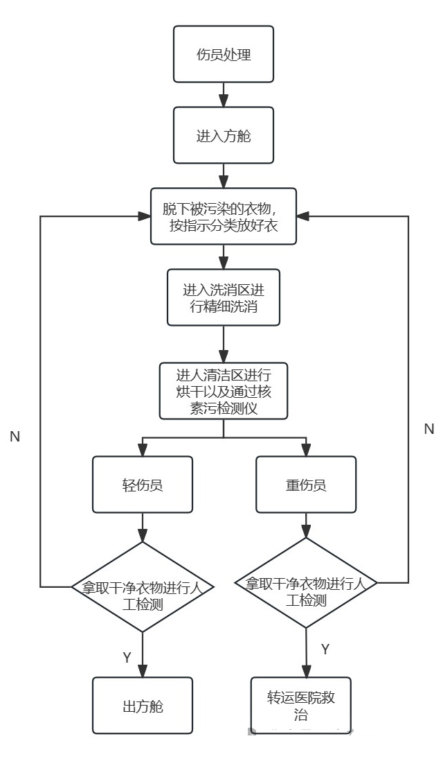 傷員處理->進入核化污染洗消車->脫下被污染的全身衣物->按分類放好衣服物品->在洗消區(qū)進行精細洗消->進入清潔區(qū)進行烘干跟核污染素檢測->(輕傷員拿干凈衣服進行檢查->出洗消車)->(重傷人員拿干凈衣服進行檢查->轉(zhuǎn)運到醫(yī)院救治)
