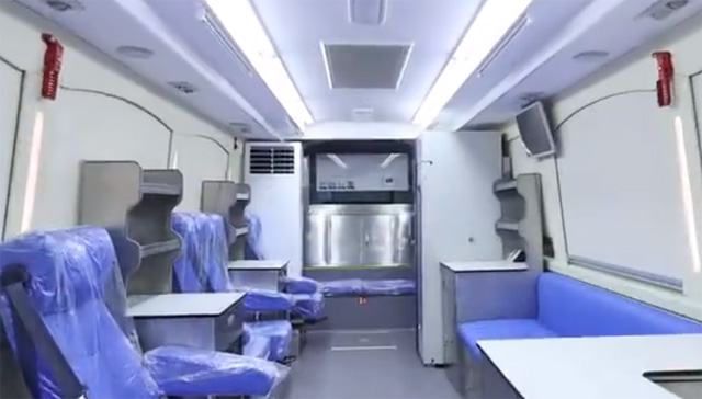 配置鋰電池系統(tǒng)的9米長(zhǎng)的采血車(chē),取消了傳統(tǒng)發(fā)動(dòng)機(jī)的供電用鋰電池完全代替??梢詽M足一天8小時(shí)的采血工作需求,鋰電池放置在下面的行李艙里面。后面這個(gè)就是整個(gè)的一個(gè)電池塊。大概有60度的電。內(nèi)飾進(jìn)行了升級(jí),包括它的風(fēng)道,頂棚,包層柱都做了一個(gè)商務(wù)改造。車(chē)廂的布局符合獻(xiàn)血流程。采血區(qū)域一共有四個(gè)采血位,可以四個(gè)人同時(shí)采血。旁邊是登記跟初篩的工作臺(tái)。負(fù)責(zé)給采血的人進(jìn)行登記。檢測(cè)血型,做簡(jiǎn)單的初篩。