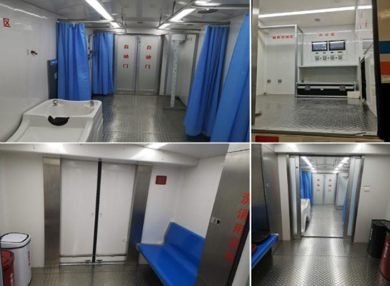 2. 核化污染洗消車空調(diào)系統(tǒng)安裝在車廂與車頭之間;水箱、洗消液箱安裝在車廂外部;車廂防腐密封結(jié)構(gòu),車廂廂體外壁和內(nèi)壁均采用光滑和圓角結(jié)構(gòu),內(nèi)外光潔。車廂內(nèi)包括污染區(qū)、洗消區(qū)、清潔區(qū)、感應(yīng)推拉門、雙開塞拉門、單開塞拉門;污染區(qū)、洗消區(qū)和清潔區(qū)由感應(yīng)推拉門相互隔離;從污染區(qū)進(jìn)入洗消區(qū)以及從洗消區(qū)進(jìn)入清潔區(qū)需經(jīng)過紅外感應(yīng)平移非接觸式感應(yīng)推拉門;污染區(qū)的入口安裝雙開塞拉門;潔凈區(qū)的出口安裝單開塞拉門;升降平臺安裝在污染區(qū)入口和清潔區(qū)出口開塞拉門外;污染區(qū)包括洗消用品柜、污染衣物回收箱、排風(fēng)系統(tǒng)、空調(diào)系統(tǒng);洗消區(qū)包括洗眼、洗頭、局部洗消、全身洗消、新風(fēng)系統(tǒng)、排風(fēng)系統(tǒng)、空調(diào)系統(tǒng)、污水排放口和外接污水收集袋;清潔區(qū)包括中控平臺、核輻射檢測儀、更衣柜、烘干室、電器柜、新風(fēng)系統(tǒng)、空調(diào)系統(tǒng);核輻射檢測儀為門柱式輻射儀,安裝在清潔區(qū)感應(yīng)推拉門旁側(cè);人員每通過感應(yīng)推拉門前由核輻射檢測儀進(jìn)行輻射水平檢測及核素檢測。