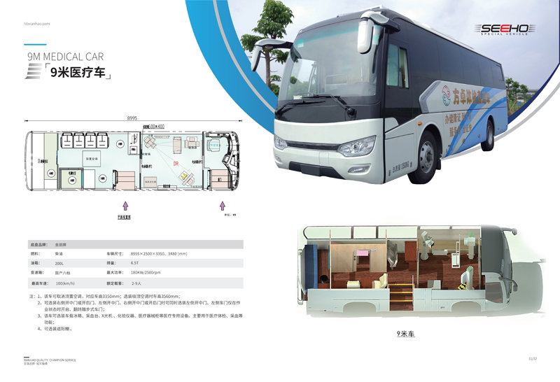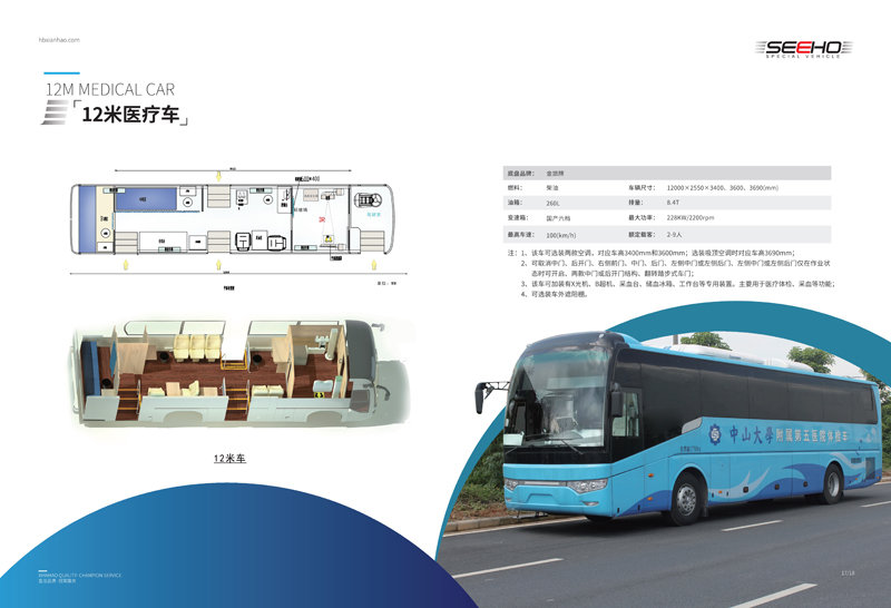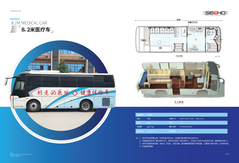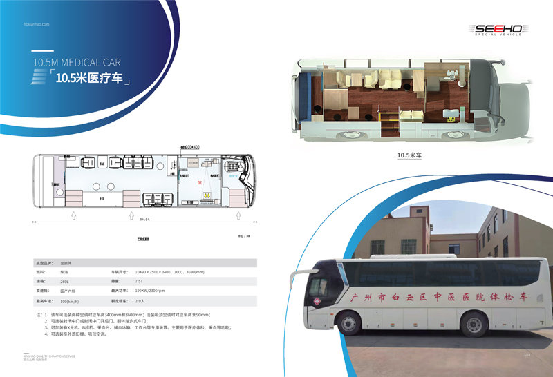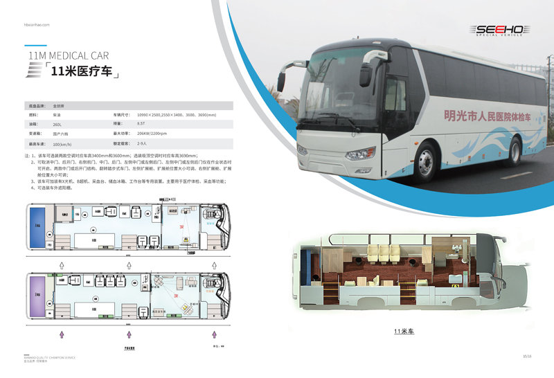 顯浩專用車生產(chǎn)的體檢車均選用一線品牌車(宇通、金龍、金旅)實(shí)用、先進(jìn)、布局合理、操作方便、駕乘舒適。 體檢車長有6米、7米、8.2米、9米、10.5米、11米、12米可選。